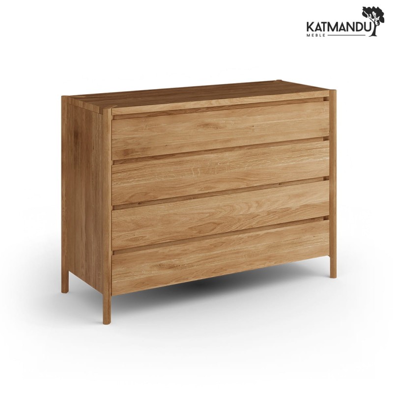 Komoda Katmandu CAMPI to idealny przykład tego, jak nowoczesna prostota może spotkać się z funkcjonalnością i naturalnym, ciepłym charakterem litego drewna. Jasny, delikatnie złocisty odcień dębu wnosi do wnętrza harmonię i przytulność, a oszczędna forma bez klasycznych uchwytów nadaje meblowi elegancką, współczesną linię.