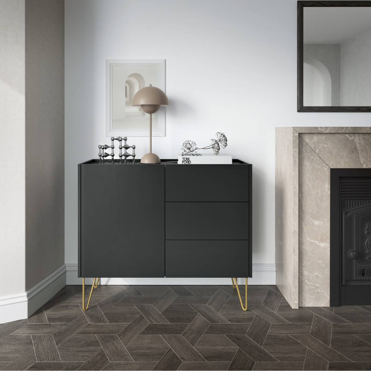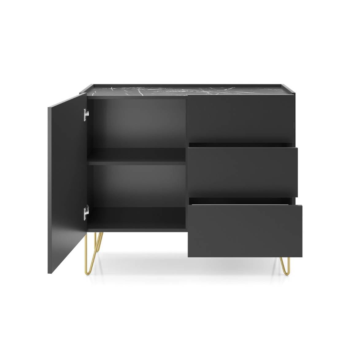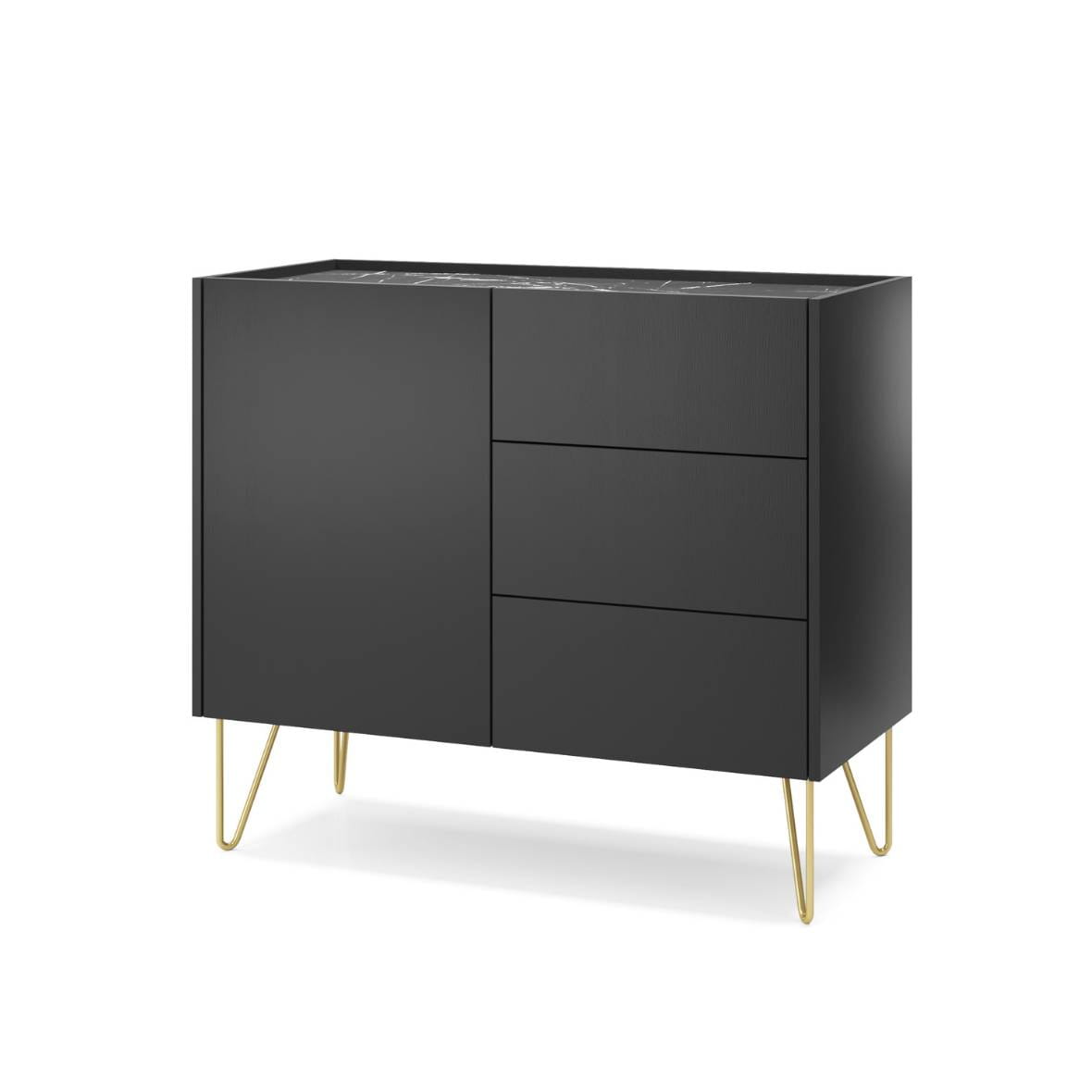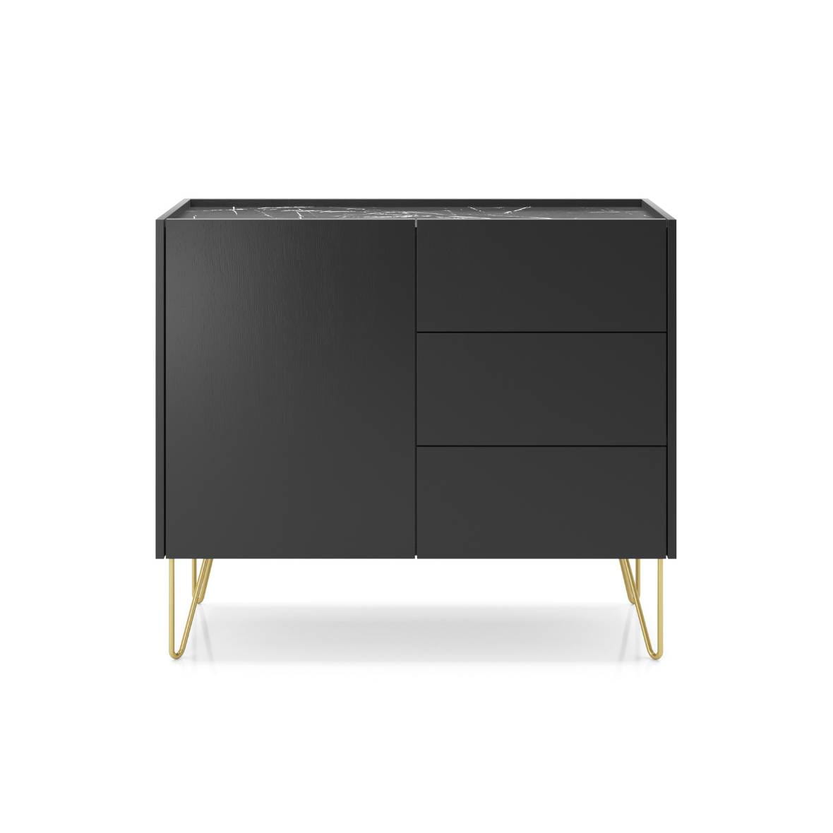 Komoda Piaski HARMONY KSZ97 Czarny / Złote nóżki / Marmurowy blat / Z szufladami i szafką