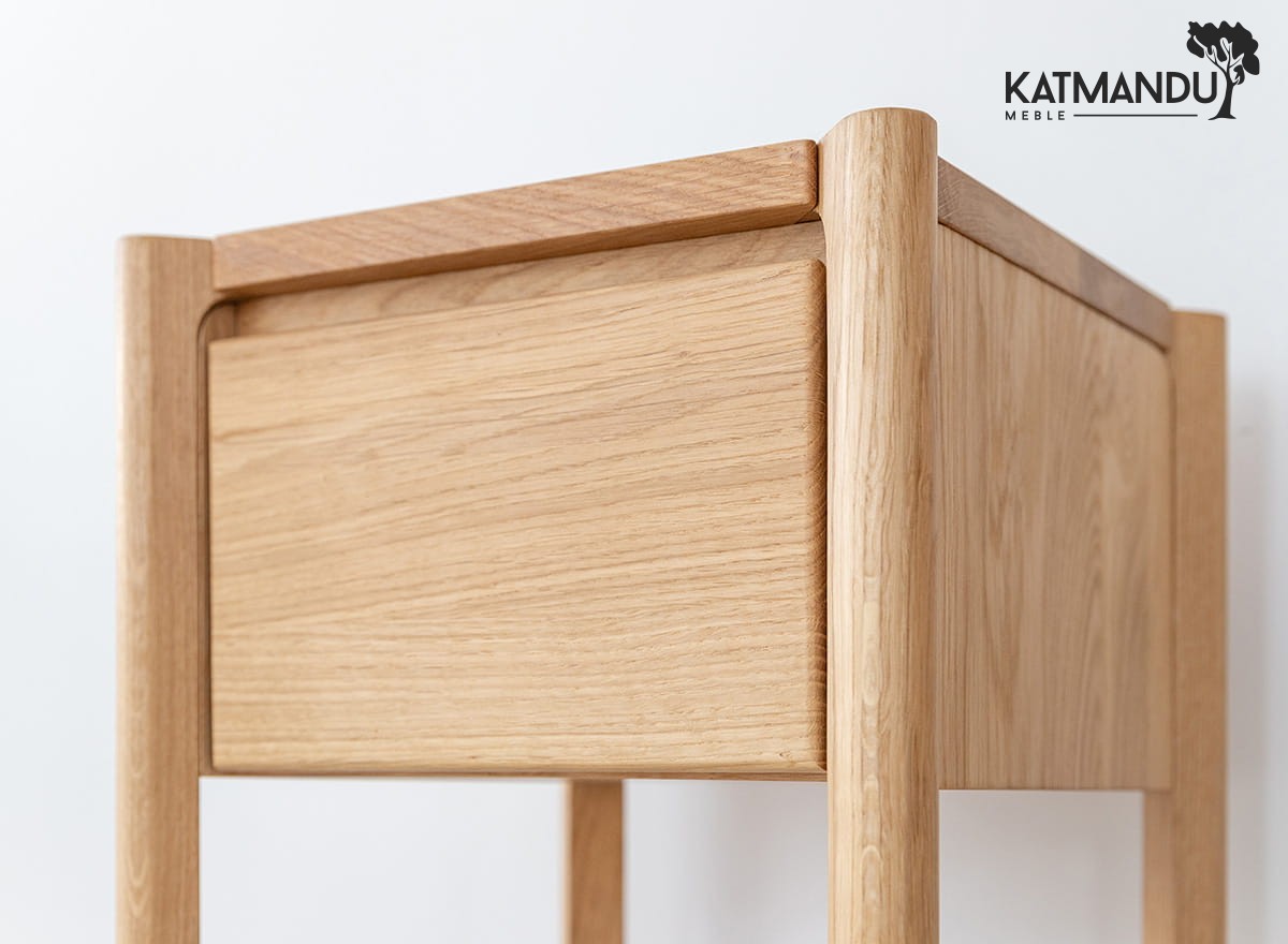 Dzięki kompaktowej formie stolik świetnie odnajduje się w wielu rolach: jako szafka nocna w sypialni, pomocnik przy sofie lub fotelu w salonie, a nawet jako elegancki organizer w przedpokoju. To mebel, który nie narzuca się formą, ale subtelnie porządkuje codzienność, dodając wnętrzu charakteru.
