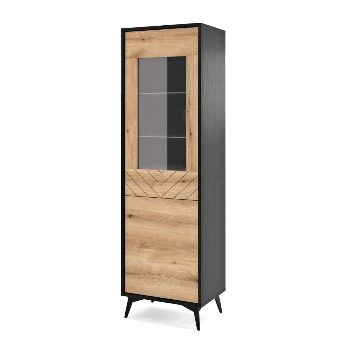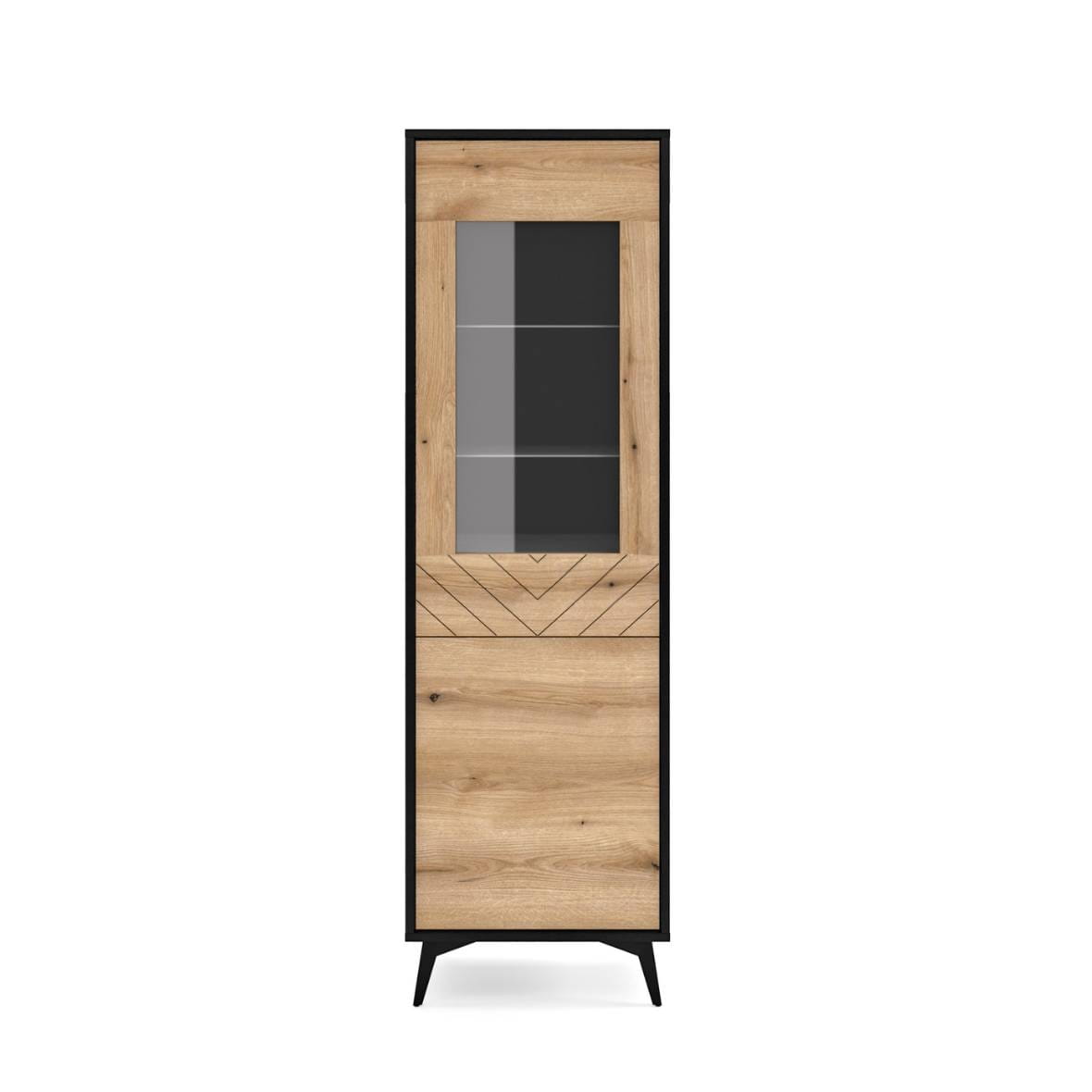 Witryna PIaski DIAMOND W54 Dąb Evoke / Czarny z pólkami za przeszklonym frontem